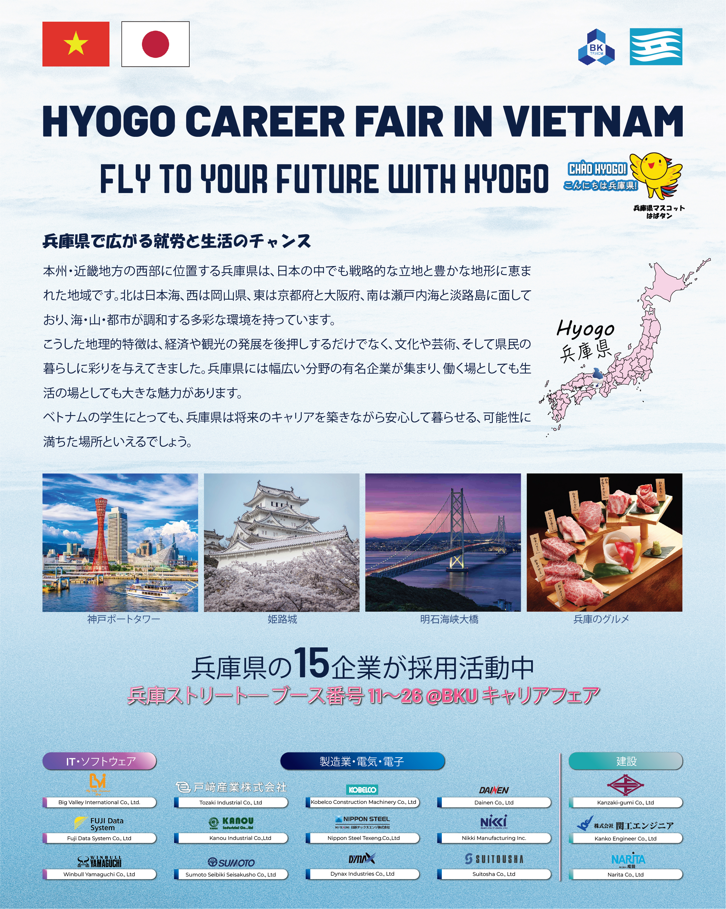 Năm nay, trong khuôn khổ chương trình hợp tác đặc biệt cùng Trường Đại học Bách Khoa TP.HCM, tỉnh Hyogo tự hào mang đến 14 doanh nghiệp hàng đầu tham gia sự kiện tuyển dụng và giao lưu...